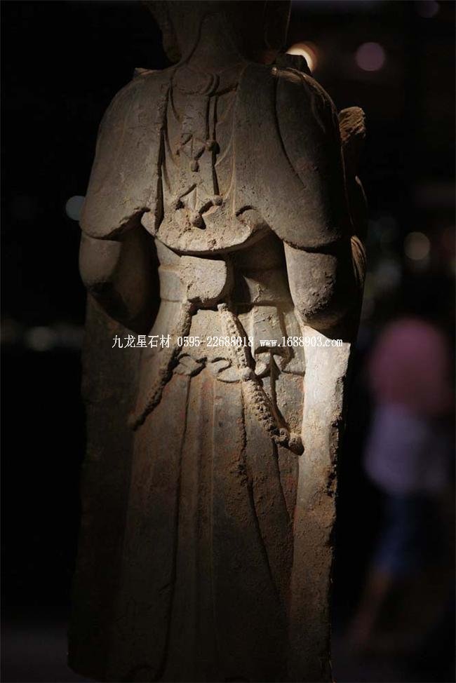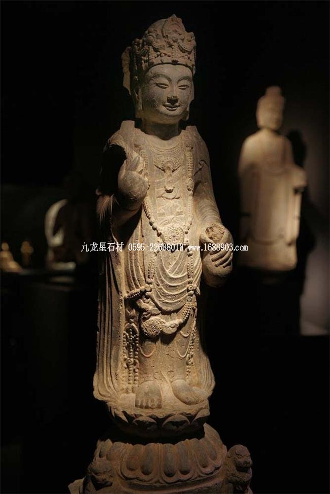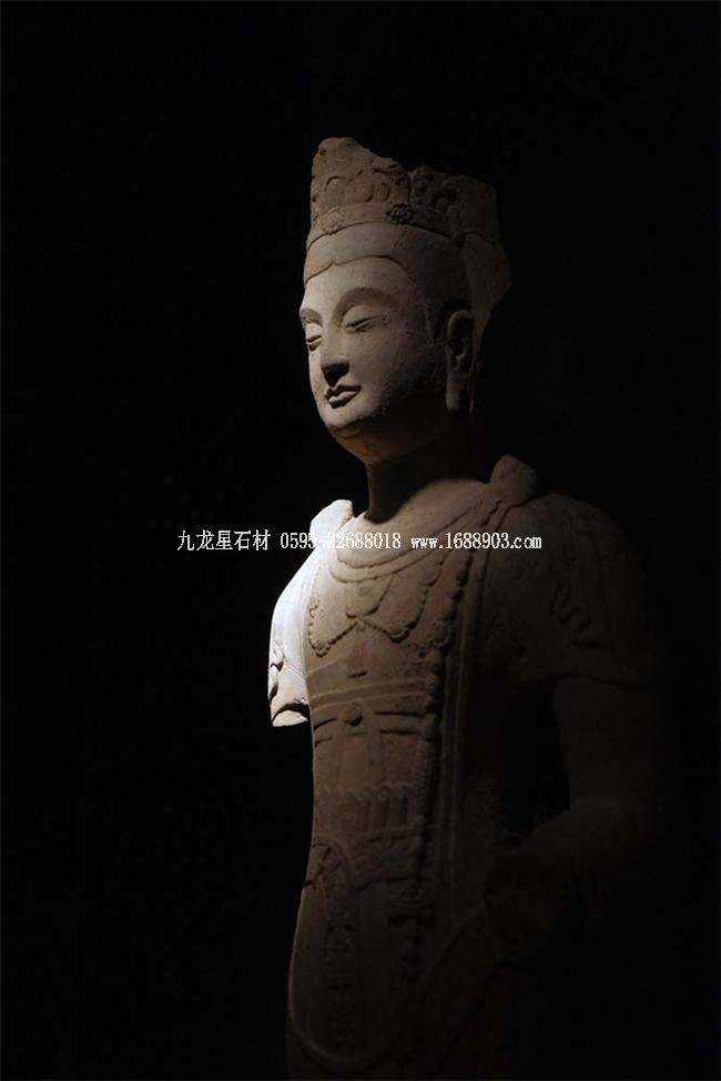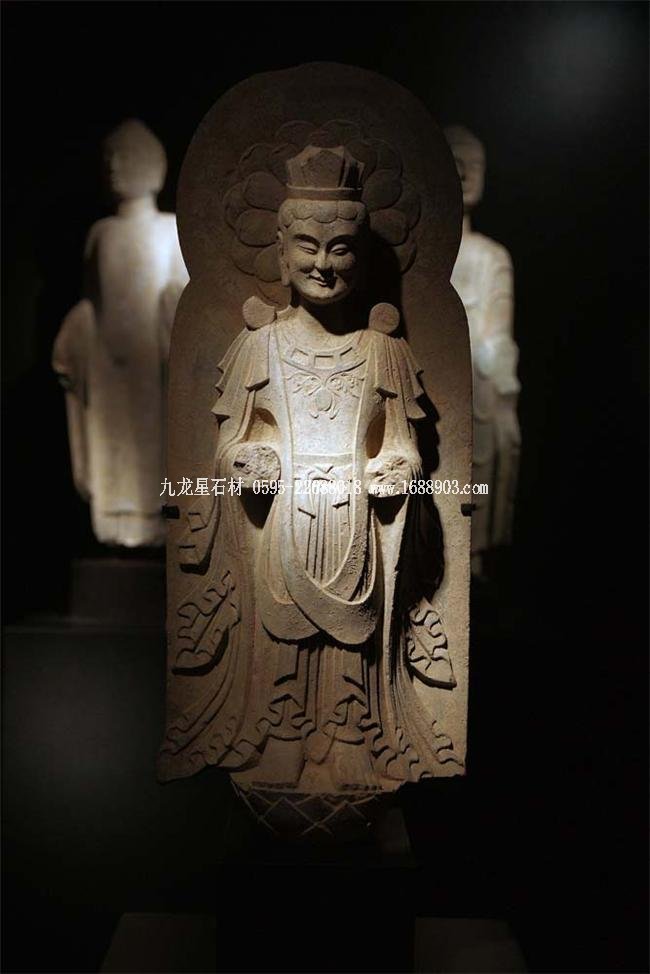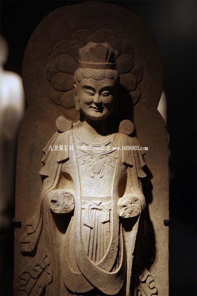 北魏、北齊時(shí)期,佛像雕刻藝術(shù)趨于巔峰極致之境界。北魏佛像造型挺拔秀美,細(xì)腰寬背,衣紋是富于裝飾的淺刻。北齊造像多為面型豐腴,衣紋簡(jiǎn)潔,服薄貼體,整體平潤(rùn)光潔,與面部寧?kù)o安祥的表情和諧一致。這類疏簡(jiǎn)淳潤(rùn)的佛像造像,無論從光潔的肌體或平滑衣物里,似乎都能感覺到內(nèi)部筋肉的輕微變化。潤(rùn)澤的體面與舒緩下垂的線條,使形象在疏簡(jiǎn)平淡中流露出內(nèi)在的氣質(zhì)。
