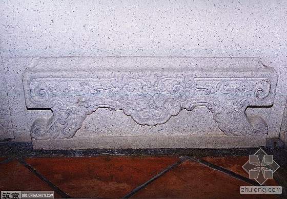 | 圖中左右兩個壁柱下石作下段也一樣,稍小。和須彌座的圭角一致的是都立于土襯石上。按照劉大可《中國古建筑瓦石營法》標準的須彌座的圭角用如意云。倒是圖中形狀有象龜腳之處;整體應該是仿幾案。臺灣研究閩南古建的學者稱之為“柜臺腳”。