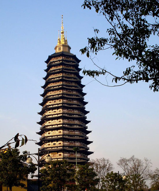 天寧寶塔乃中華第一佛塔(全球最高佛塔)位于江蘇省常州市天寧寺內(nèi)。天寧寶塔始建于2002年4月,于2007年4月30日開光??偨娣e2.7萬平方米,塔高13層153.79米,為國內(nèi)4000多座寶塔之最;從底層地宮到頂層鐘樓,整座寶塔以佛教文化為主線,以東陽木雕、揚(yáng)州漆器、常州亂針繡、惠安石雕等手工藝術(shù)為表現(xiàn)手法,巧妙地詮釋了大乘佛教的諸多教義。佛塔的建成,與北方云崗大佛、中原龍門大佛、西方樂山大佛、東方靈山大佛、南方香港天壇大佛遙相呼應(yīng),成為五方五佛的佛心。