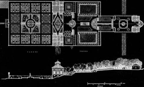 莊園四層臺地的布局均由一條中央軸線連接而成。中央軸線為一流水線,而各臺地再此軸線上都設有水景?;▔?、建筑、臺階等均對稱布置在軸線兩側。在園路布置方面也順應軸線兩側布置,再以橫向園路連接。整個園雖由圍墻封閉,但在橫向縱向均設有多個門口方便出入。由于莊園設在臺地上,所以臺階的布置尤為重要。臺階不僅僅是用于連接每層臺地,另一重要的作用是引導游人走向園中最美的景色中。所以每一層的臺階布置都有所不同。如連接二、三層的臺階并沒有設為縱向連接,而是設為橫向上坡,其目的是讓客人的目光轉向美麗的水景。而連接三四層的臺階也是為了將客人引向水階梯。