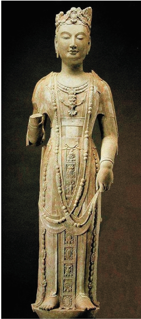 1996年,青州龍興寺遺址窯藏共出土北魏至北宋佛教造像400余尊,其中以東魏和北齊時(shí)期的數(shù)量最多。青州地區(qū)曾先后隸屬于南朝和北朝,南北文化 上的交互影響較為明顯,在公元469年北魏占領(lǐng)青州以前,青州長(zhǎng)期隸屬于南朝,所以在造像風(fēng)格上與北朝造像有明顯的不同。青州地區(qū)佛教造像除政治沿革遺留 的影響,還應(yīng)有不同地區(qū)交流的因素。這時(shí)海路可以與東南沿海相通,笈多美術(shù)通過(guò)海路傳入也在一定程度上促進(jìn)造像樣式的形成與發(fā)展。如東晉義熙年間,法顯自印度取經(jīng)回國(guó),返抵青州,青州長(zhǎng)廣郡太守李巍敬信佛法,迎接經(jīng)像歸至郡治,留法顯一冬一夏,法顯所奉佛像自然是地道的笈多風(fēng)格。