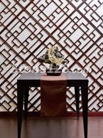 在新中式風(fēng)格的大廳中,石雕作品的外形與背景窗花的菱形相互協(xié)調(diào),取得了很好的諧調(diào)效果。石雕的色彩與整體環(huán)境的深色調(diào)相互統(tǒng)一,臘梅花典雅的黃色又活躍了色彩的意境氛圍。整體空間的直線風(fēng)格與石雕作品的曲線造型相對比,剛?cè)嵯酀?jì),收放有度,取得了很好的視覺效果。
