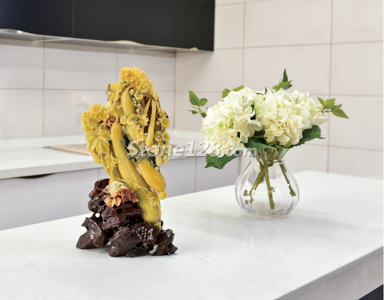 擺放在餐廳,既有美滿和諧的氛圍,又有艱苦奮斗的寓意。作品的曲線造型與餐廳環(huán)境的直線造型相互彌補(bǔ),中和了各自的不足。深色的餐桌及背景很好地襯托了淺色的石雕作品,給整個空間注入了生命力。
