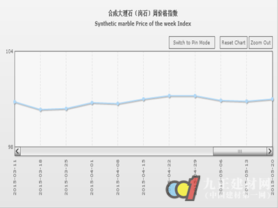 合成大理石類(lèi)本周價(jià)格指數(shù)收?qǐng)?bào)于100.99點(diǎn),回升0.14點(diǎn),回升0.14%。本周合成大理石類(lèi)價(jià)格有所回升,其中荒料及成品價(jià)格繼續(xù)與上周持平,大板價(jià)格小幅反彈。部分合成大理石大板因出口需求有所增加,交易價(jià)格小幅提升。