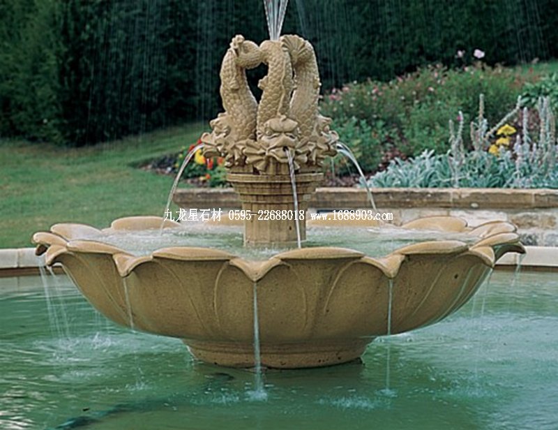 銹石蓮花水缽缽盤直徑約2.2米,配置四尊噴水石雕魚。寓意“步步蓮花,財源不斷”。